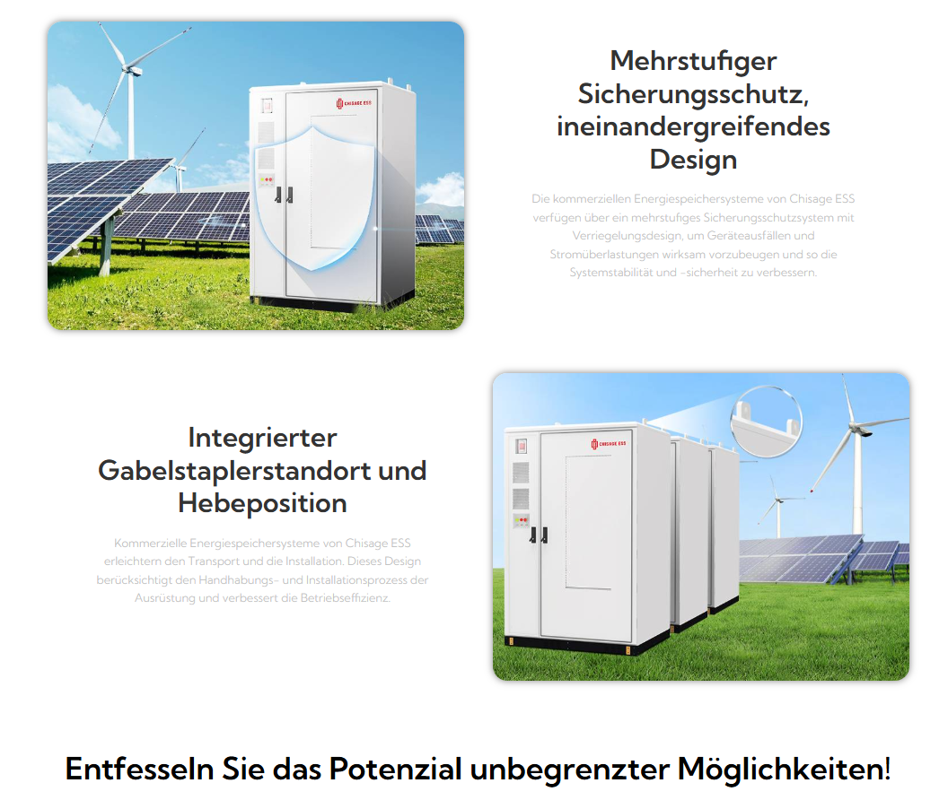 Das CHISAGE ESS Gewerbespeichersystem CE100215-B 100 kW / 215 kWh wurde speziell für gewerbliche und industrielle Anwendungen entwickelt, bei denen hohe Leistung, Zuverlässigkeit und Sicherheit im Vordergrund stehen. Mit 100 kW Nennlade- und Entladeleistung und 215 kWh Speicherkapazität eignet sich das System ideal für Lastspitzenkappung, Eigenverbrauchsoptimierung, Notstromkonzepte und netzdienliche Anwendungen in Unternehmen.