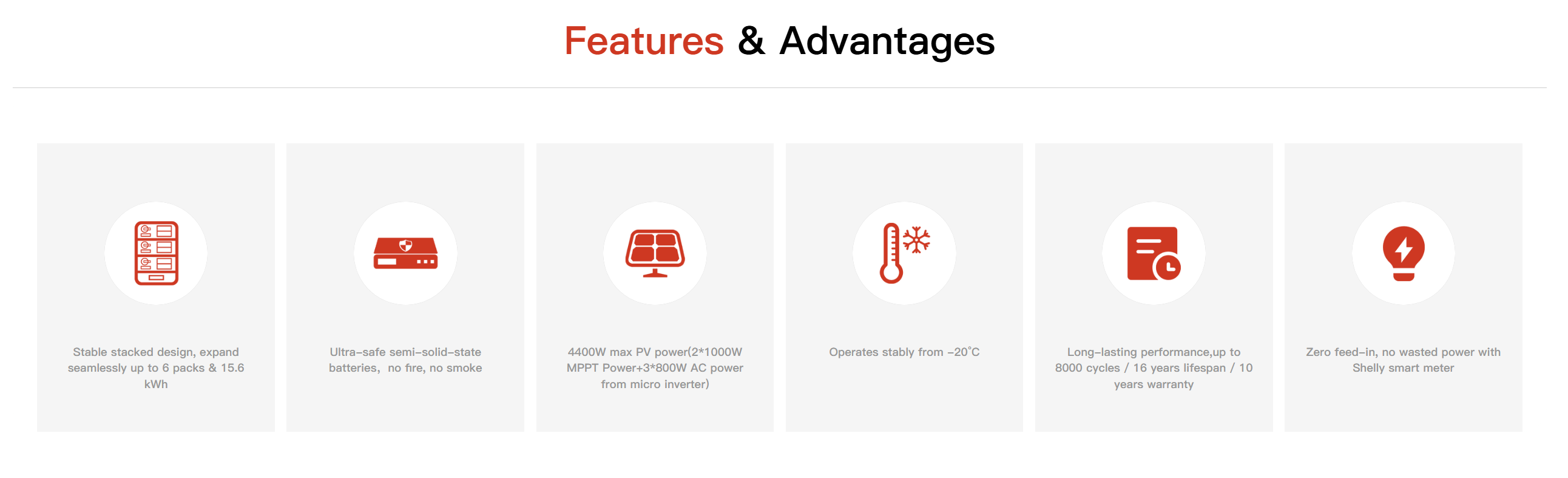 Ein sicheres und zuverlässiges Solarspeichersystem für den Balkon mit modernster Festkörperbatterietechnologie. Ausgestattet mit einem 2400-W-Wechselrichter unterstützt es Solarmodule mit bis zu 2000 W und Mikro-Wechselrichter mit bis zu 800 W Leistung und liefert eine maximale PV-Leistung von 2800 W. Stapelbare Batteriepacks ermöglichen eine erweiterbare Speicherkapazität von bis zu 15,6 kWh. Dank Plug-and-Play-Design ist die Installation kinderleicht. Die smarte App ermöglicht Fernsteuerung, Überwachung und flexibles Energiemanagement. Hohe Zuverlässigkeit, lange Lebensdauer und Kosteneinsparungen – eine Installation, jahrelanger sorgenfreier Betrieb.
